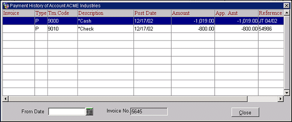 The Pay History feature allows you to view a complete record of payments made on an invoice. To access the payment history for an invoice, highlight the invoice or the payment on the AR Account screen and select Pay History from the Account Posting Options menu. (The Account Posting Options menu is accessed by selecting the Options button from the AR Account screen.) The Payment History screen appears.