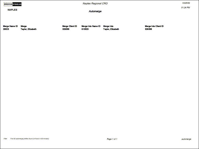 Note: The Automerge Report is not a verification tool, but rather a report that provides, at the time it was run, the approximate amount of profiles that will be merged. As the number of profiles in the client database can be quite large, in some cases a complete profile result set is not possible in the report. The system limits the results to 50 matched profiles or 30 minutes of report processing time. The results should be enough for the user to decide to proceed, change, or cancel the automerge process. As indicated, the report provides data relevant at the time it was run. If the Background Processor Profile Automerge process is activated at a later time, and the same Automerge criteria is set, the profile result set may be different from the report. New profiles may have been inserted into the database after the Automerge Report was run.
