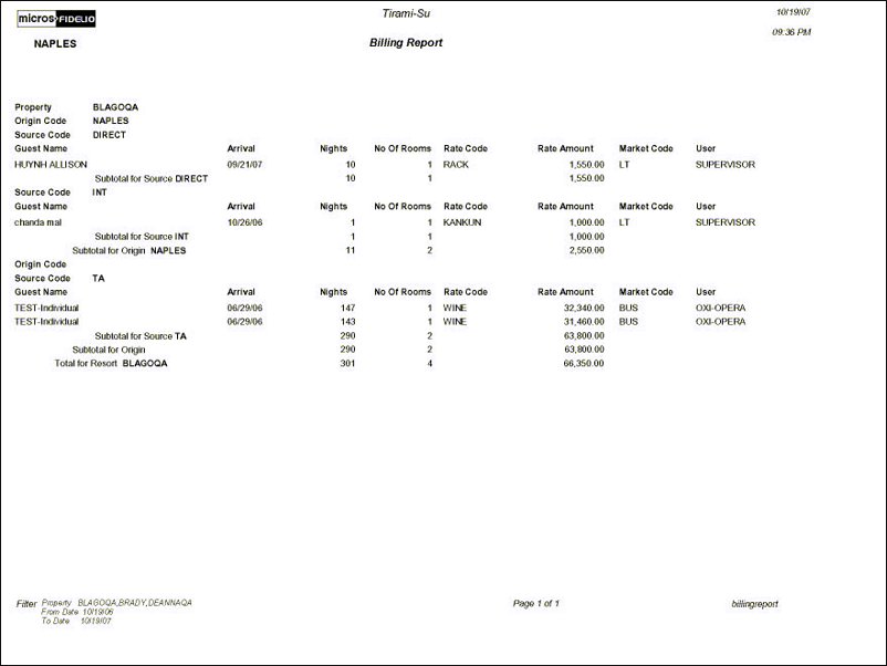 The Billing Report provides the rate code and rate amount billed to guests for the selected property within the chosen date range. The reservation Source Code and Origin Code are included for each reservation, as well as the Source and Origin subtotals.