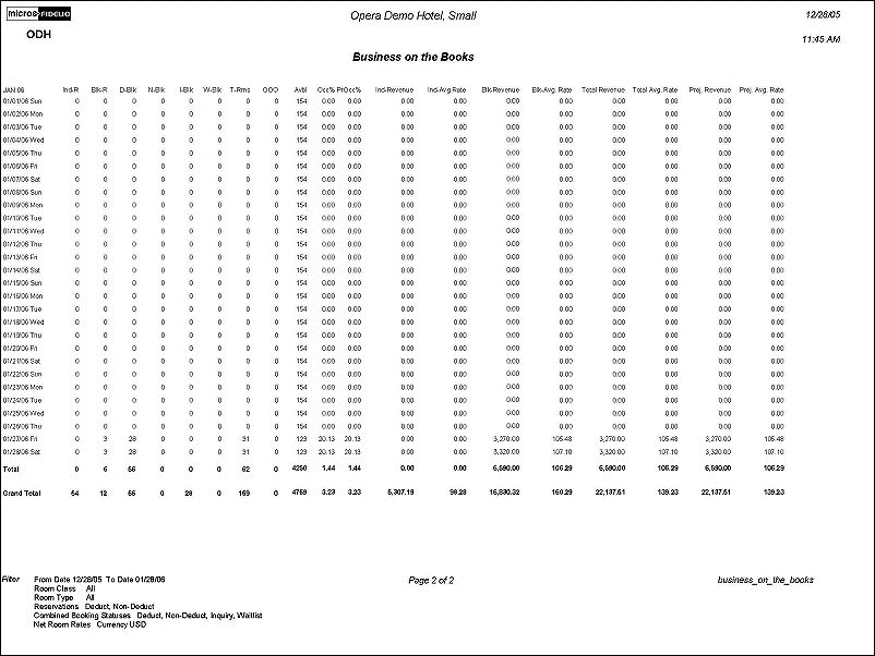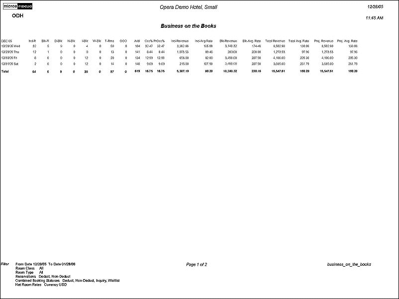 The Business on the Books report displays a mix of business currently comprising a property's occupancy from the current business date to any future date. The Business On the Books report can be directly compared to the History Forecast report as long as the Business On the Books report includes block rooms not picked up. The History Forecast report combines block rooms and reservations into one column; therefore this is not a column-to-column comparison. Some manual addition will need to occur to properly compare the two reports.
