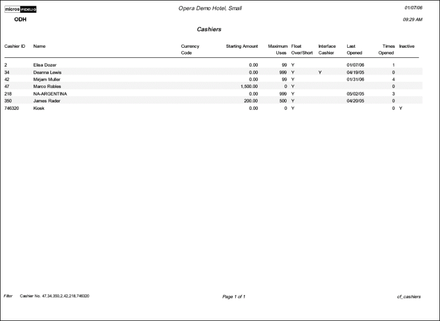 The Configuration report for Cashiers will display all configured cashiers for your property. For a multi property environment, this list will contain all cashiers that have been configured in the application, and thus for all properties.