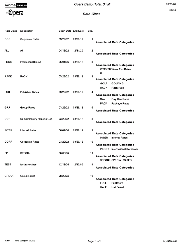 The Configuration report Rate Class will display all Rate Classes that have been configured. If the license code for multi property functionality is activated (OPP_MHOT), this report will represent all codes on the template form.