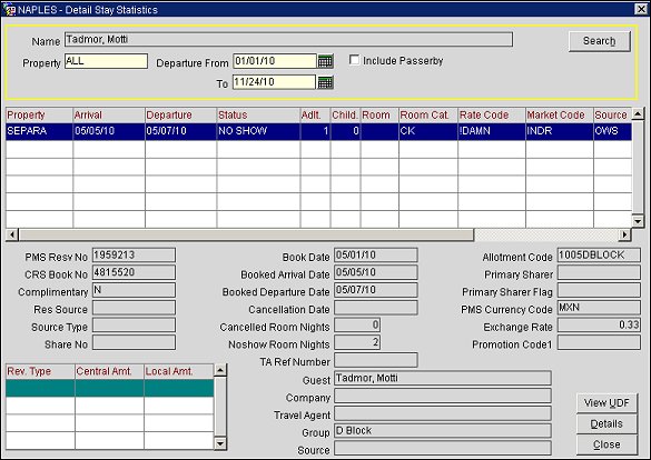 Select the Details button on the Stay History by Property screen to go to the Detail Stay Statistics screen. This screen shows detailed stay information for the properties and date range you select. (The defaults are the properties and dates currently displayed in the Stay Statistics by Property screen, but you may change these.)  The information displayed on this screen is view-only and cannot be edited.