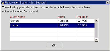 If there are commissionable payments associated with the selected reservations, the reservation will be attached to the agent profile for commission payments. If no commissionable payments are associated with the selected reservations, you will receive a message indicating which of your selections will not be included for payment. Select the OK button to return to the Reservation Search screen.