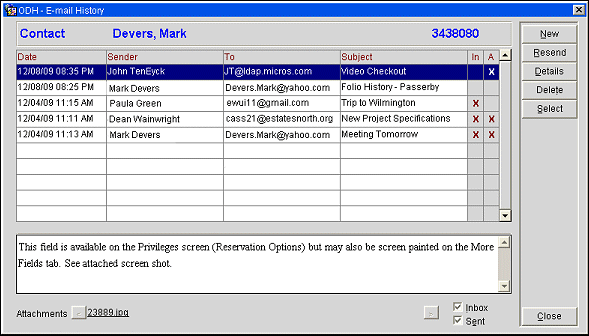 Note: Only messages that have been sent from OPERA can be displayed in the text area. The text area is not available for imported messages. To see these messages, highlight the message and select the Details button to display the email message in a new browser window.