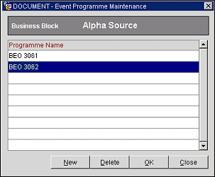 To create a new programme, select the New button. Programmes are automatically created in numerical sequence. You cannot delete a programme if events are already assigned to it.