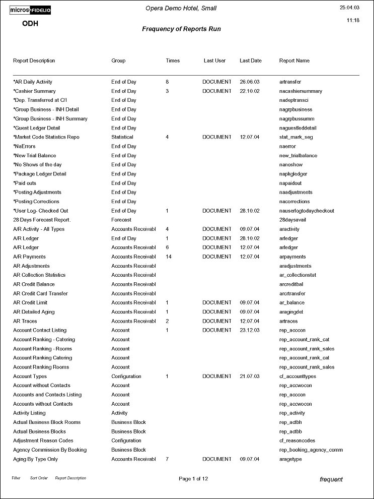 The Frequency of Reports Report generates statistics about all the reports configured in the hotel. The information includes the report name, the number of times it was generated, the last time it was printed, the last user name, and, for procedure reports, the name of the procedure.