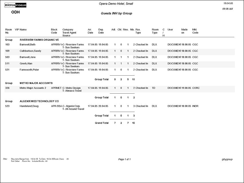The Guests in House By Group Report displays detail for all Blocks in house grouped by Block. Print this report for tour escorts or convention coordinators who want to have and in house list of multiple or specific groups.