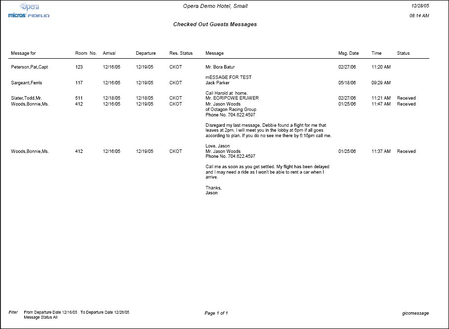 The Checked Out Guest Messages Report displays a list all checked-out guests, the departure date, message, and the status of the message. This report can be filtered by specific date, date range, or message status. Telephone operators and front desk personnel can print this report to verify messages status for checked out guests.