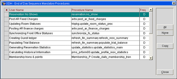 Select Configuration>Setup>End of Day Sequence>Procedures>Mandatory Procedures to see a list of the mandatory procedures for the property. The mandatory procedures are system supplied and cannot be changed.