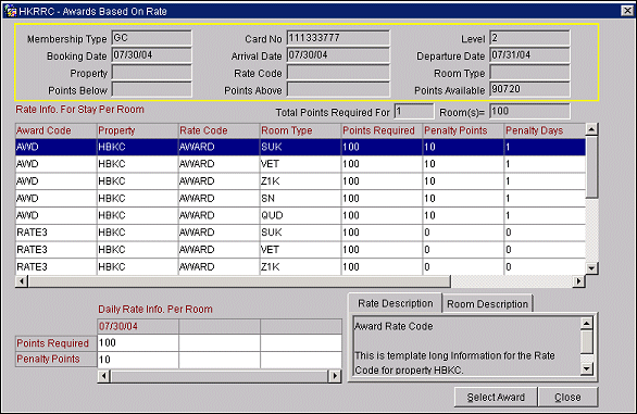 If you select Rate as the basis to issue an award from the Query Awards screen and select the Availability button, the Awards Based on Rate screen appears. At this screen, view the list of awards displayed based on the criteria you chose, including the arrival and departure dates. Highlight the award you want to grant and select the Select Award button.