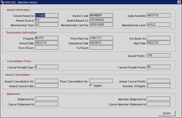 The Member Award screen is read-only and is used to review the guest's history and details of the award that was selected from the Member Award List screen. Information displays such as the issued award details, membership information related to the award, reservation information related to the award, the cancellation policy, and the cancellation information if the award was canceled. This information was entered either by the user in other membership screens or generated by OPERA.
