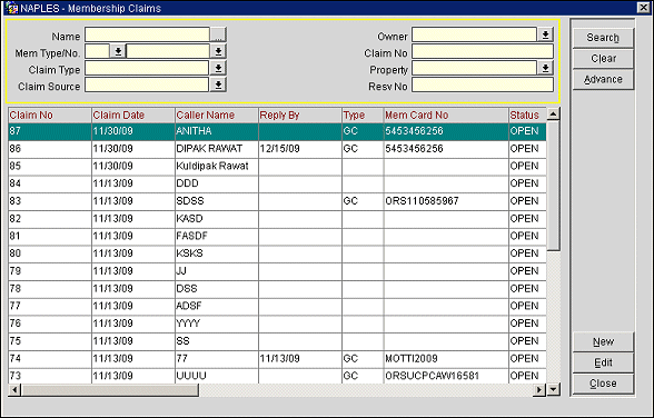 This screen allows you to search for claims, and then subsequently review the details for existing open or resolved claims, and enter new claims into the system.