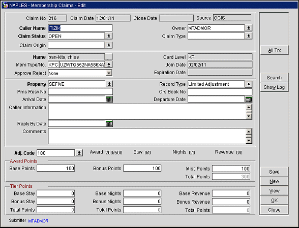 While working in the membership claims screen to resolve a claim, select the All Trx button to view a complete list of award points transactions and adjustments for the current member. If the Membership Exceptions parameter is enabled (Setup > Application Settings > Membership > Parameter > Membership Exception=Y) you can also view various membership transaction exceptions that may have occurred for this member. You may view details and choose to grant awards and/create adjustments to the award points transactions.