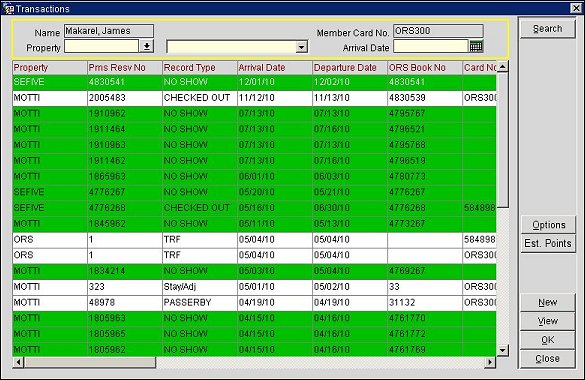 The Transaction screen shows each membership transaction and all related information. The Green rows indicate that points have not been calculated, either because an exception was found and has not yet been resolved, or because of the batch processing date not having yet been met. To view the actual membership transaction, select the View button. The Membership Transaction screen (view-only) appears.
