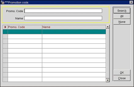 This screen displays the promotion codes that are not yet attached to the profile. From the Promotion Code screen you can search for a promotion code and select it to attach to the profile.