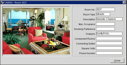 Once they have been configured, room type and room images are accessible from various places in OPERA. Pictures of rooms and room types can be displayed from the Available Room Search screen, Room Assignment screen, the Housekeeping Room Discrepancy screen, the Room Plan screen, the Floor Plan screen, the Rate Query screen and the Function Diary (when the OPS<version_number> Sales & Catering license is active). Along with the pictures are details about the room or room type.