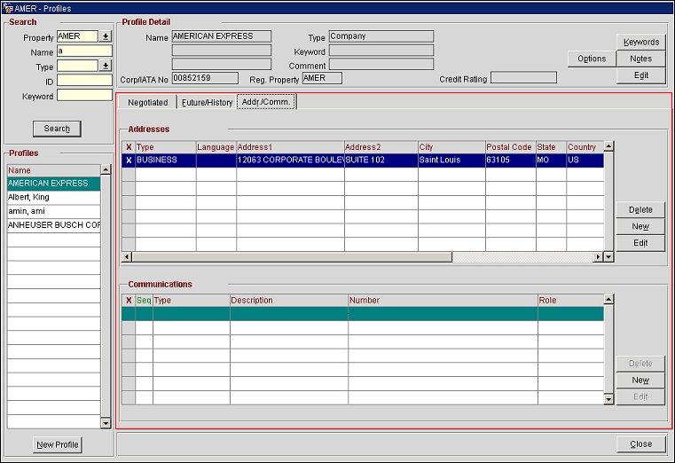 The Addr./Comm. tab displays address and additional communication information. The tab consists of two grids; the Addresses grid and the Communications grid.