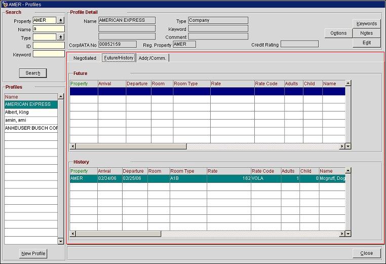 The Future/History tab provides view-only information about future and past reservations. The tab consists of two grids; the top grid displays future reservation information and the bottom grid displays stay history information.
