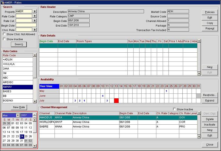 The Calendar area of the screen allows a user to easily select a date to work with a rate. To change the date, select the month and year, and then select the date. The information displayed in the Availability area changes based on the date selected.