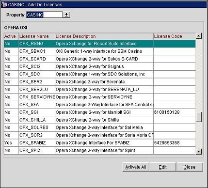 To activate the license code, highlight the License Name, select the Edit button, and enter the corresponding license code. The following table shows the available add-on licenses for HTNG: