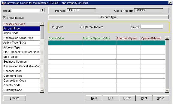 The Conversion Codes for Interface XXX and Property YYY screen allows a user to activate the conversion tables that should be used for a specific interface. To access this screen, login to OXI, select the "SpaSoft" interface at the OPERA Login prompt, and then select Interface Configuration>Conversion Codes. The Conversion Codes for Interface XXX and Property YYY screen appears.