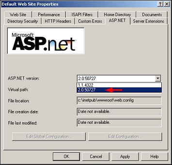 - In the ASP.NET version field, select the down arrow and select the 2.0 version, as shown below.
