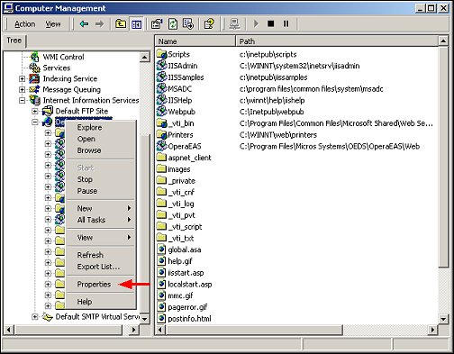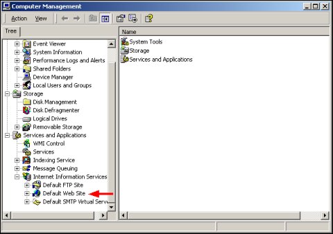 - The Computer Management Window appears. Select the + to expand Services and Applications, click the + to expand Internet Information Services, and then click the + to expand Default Web Site.