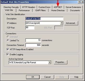 - From the Default Web Site Properties screen, select the ASP.NET tab.
