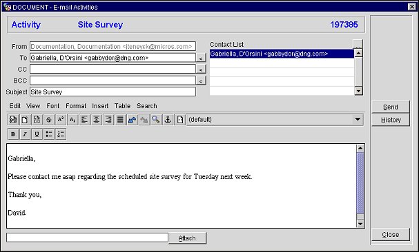 The Email Activities screen appears at various points when you double-click on an email address. For example, the screen appears when you double-click on the account email address on the Account screen, or when you double-click on the contact's email address on the Contact screen. It also appears when you select the Email button on the Activity Search screen.