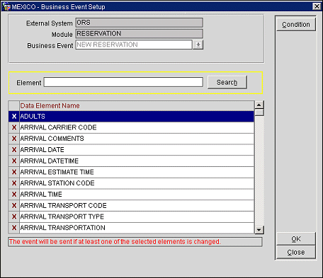 Selection of the Data Element Name is done by clicking in the X column to the left of the data element. Example: When a Data Element Name is selected here and an action is carried out in ORS that involves that data element, a business event is generated, which then becomes a message to the external system.