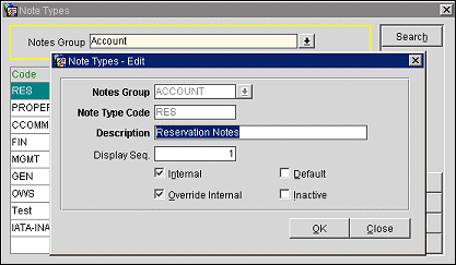Notes are completely configurable here. Sending the Notes out of the system we depend on the on screen parameters setup here. On screen parameters of ‘Internal’ and ‘Override Internal’ will be used to allow the Note to be sent or kept internal. Sample screen shot below shows Note type ‘Res’ under Account that is flagged with both.