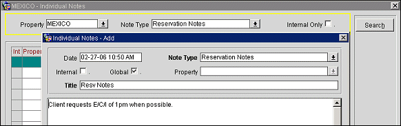 Below is an example of Note Type that has been setup to allow for Internal and Override Internal screen flagging. Selecting to create a new Note, inside screen, the Internal and Global flags are available. To allow for the note to go to the external system un-check the Internal box and leave the Global box active.