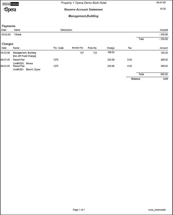 In addition, the statement displays the property name, the account number of the statement, the date and time the statement was printed, and the total balance on the account.