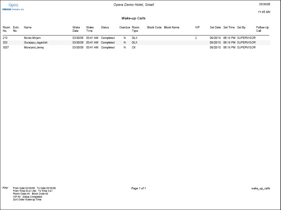 This report is available when the Reservations>Wake Up Calls application function is set to Y.