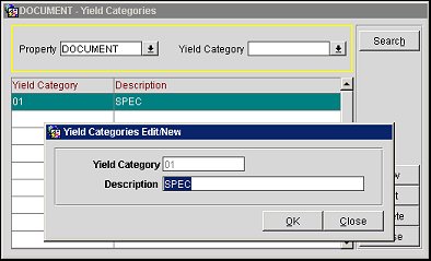 New. Opens a screen with two field to enter. Yield Category allows entry of three characters and Description allows entry of 25 characters. This screen displays  two buttons Save which saves the entered information and closes the screen, and Close, which closes the screen and does not save data.